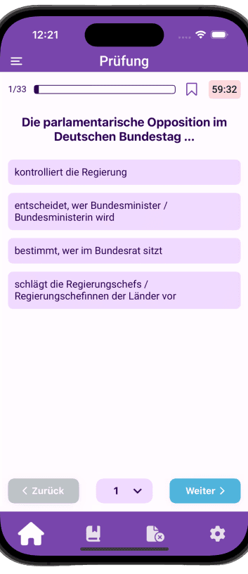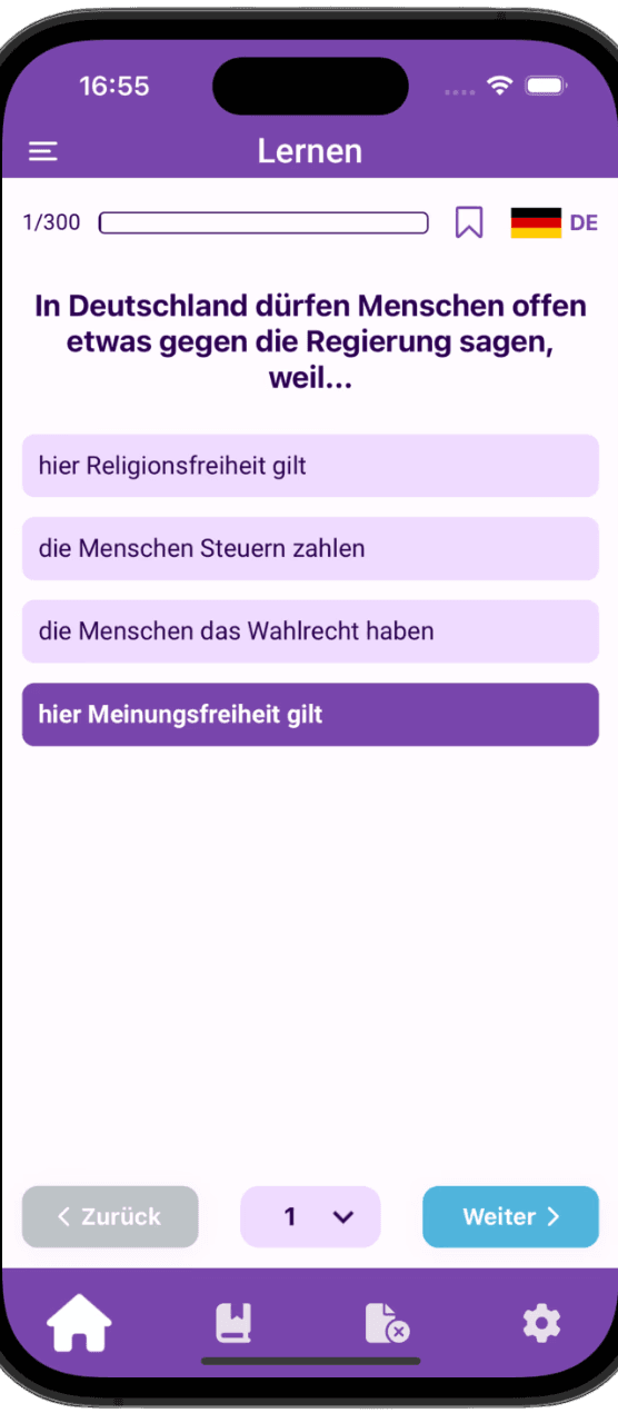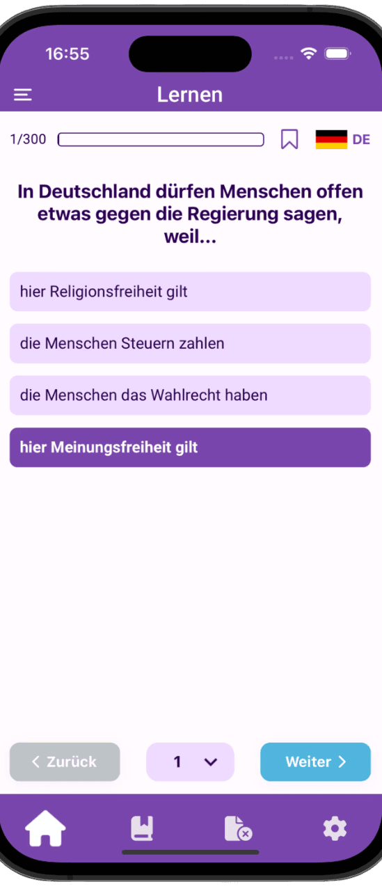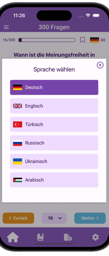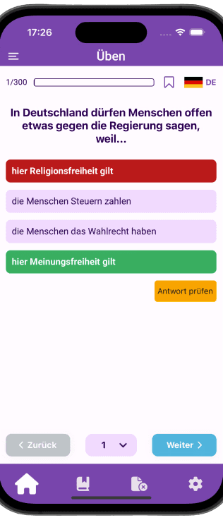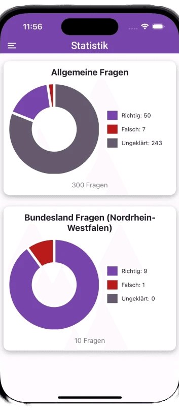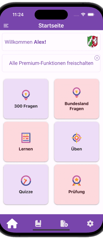 Erhalten Sie Zugang zu allen 300 offiziellen Fragen und 10 landesspezifischen Fragen. Lernen Sie smarter und erhöhen Sie Ihre Erfolgschancen mit den aktuellsten Inhalten!